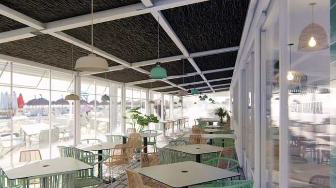 Adoptamos una paleta pacífica, en su mayoría blancos, azules verdosos y amarillos-marrones, bañados por la luz del sol, que aplicamos generalmente en el mobiliario y en algunos acabados. Estos muebles son combinados con otros de madera en tono claro que respetan y acompañan el ambiente tranquilo de mar que tiene el local.