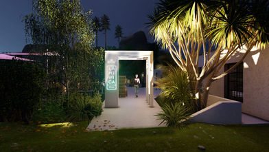 Nos hemos enfocado en la zona de la entrada para ampliar la sensación de ‘entrar’ a través de una serie de estructuras metálicas color blanco.