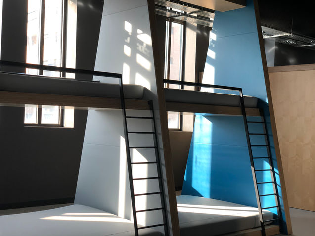 La intervención en este proyecto ha consistido en la fabricación e instalación de todos los elementos de carpintería de madera y metálica que componen este espacio, destacando por complejidad y envergadura la construcción de pórticos interiores de madera con nubes acústicas que limitan espacios de trabajo con paramentos verticales de cierre de gran escala, o las salas de reuniones fabricadas con estructura y malla industrial decorativa.