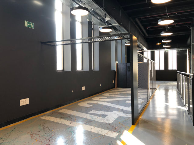 Espacio de formación con zonas de descanso, salas de reuniones, espacios colaborativos en un entorno industrial con elementos de gran envergadura. Obra principal realizada por UTE Actua Infraestructuras | Collosa